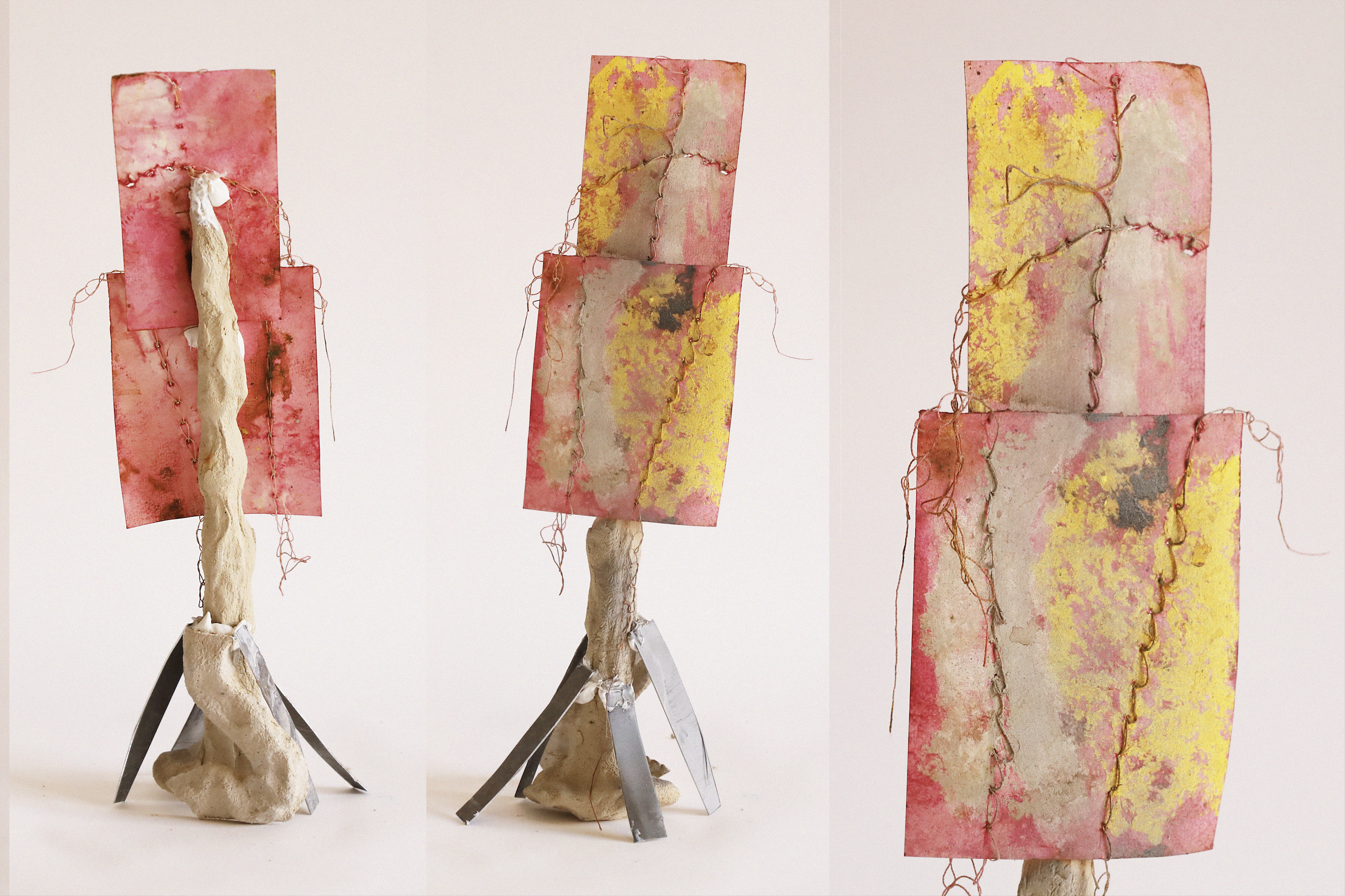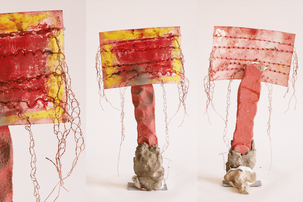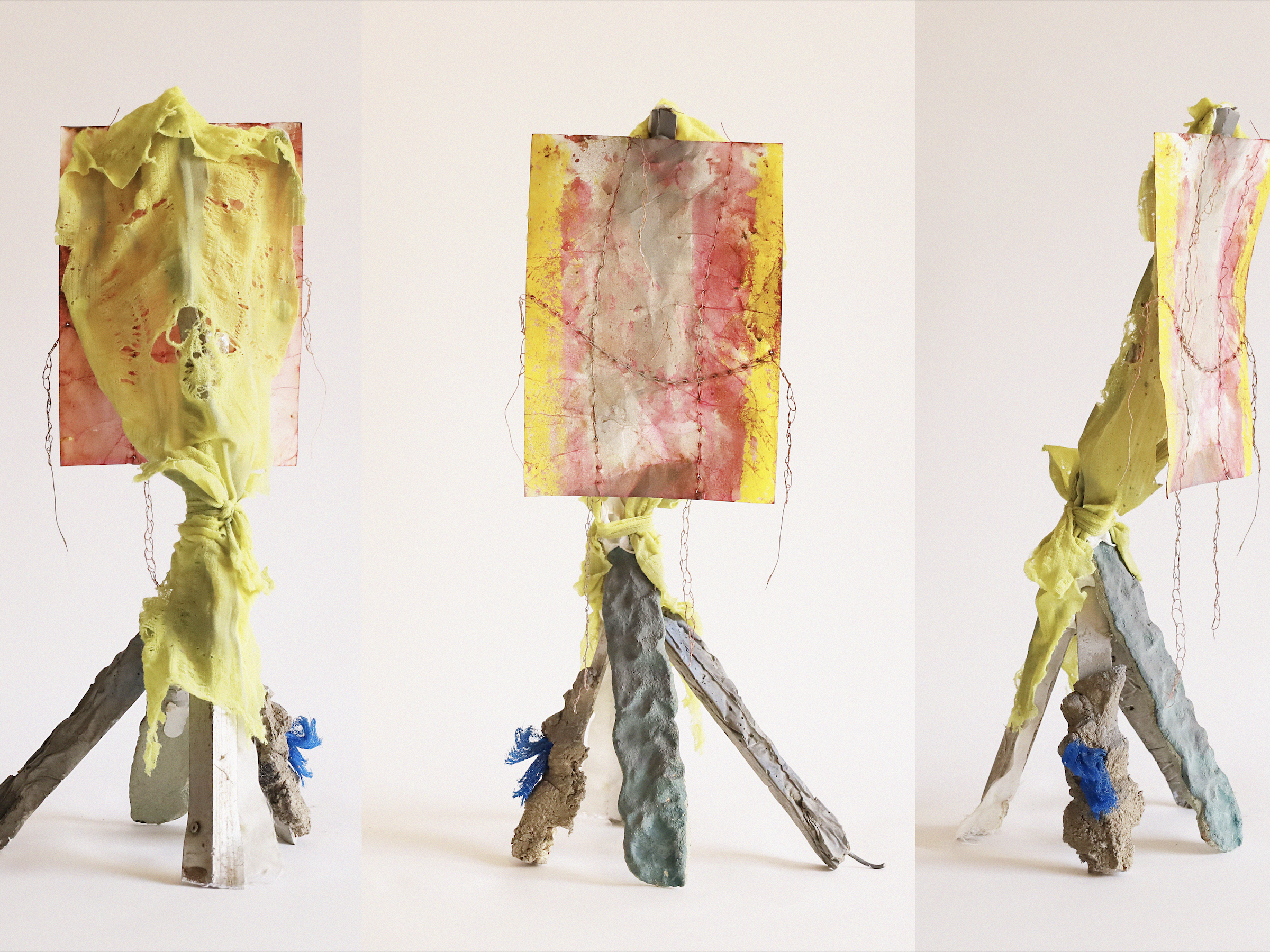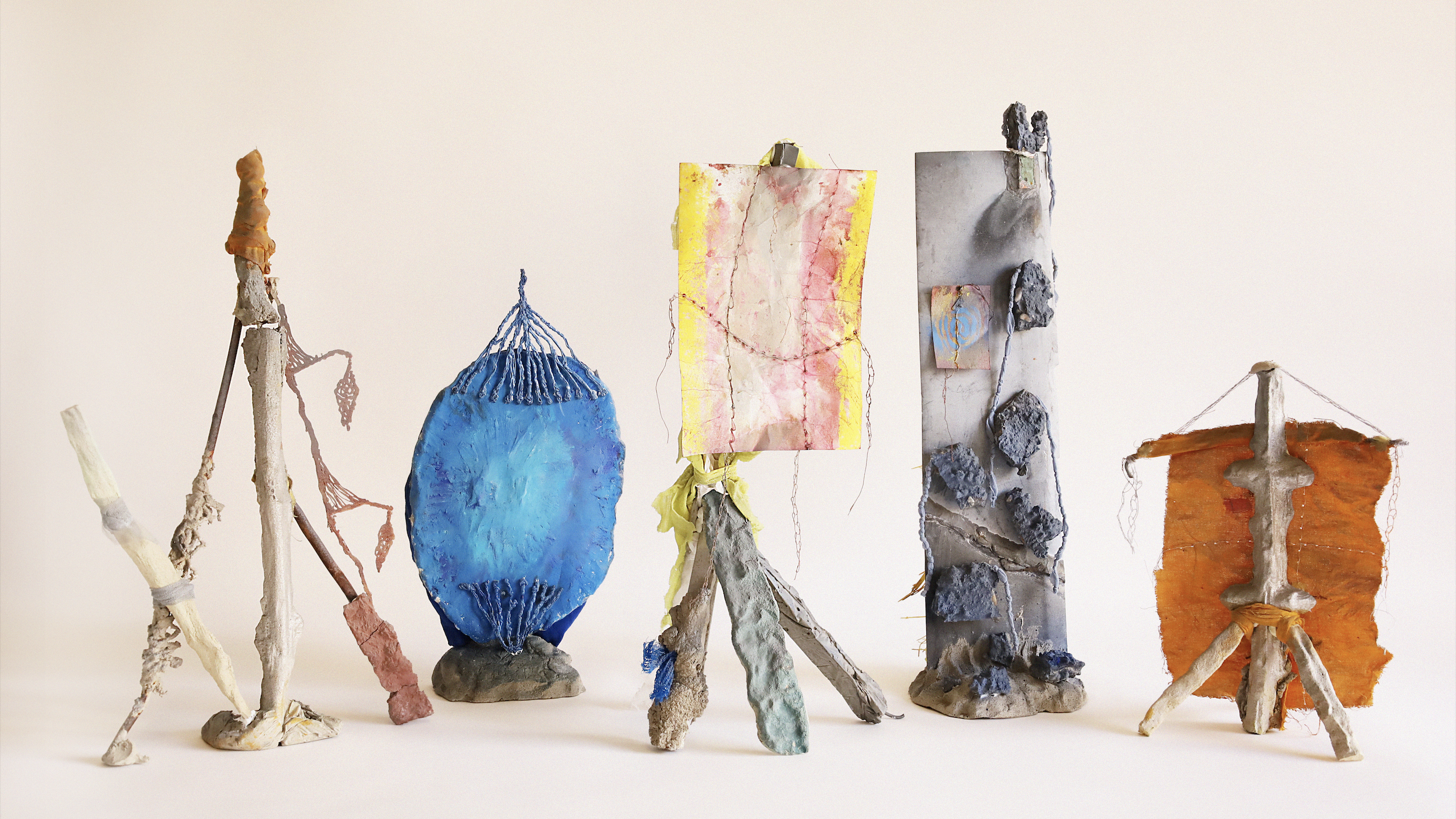 A combination of textiles, ceramics, cast aluminum, wood, scrap metal, cement, rope, plastic, paper, oil pastel, paint, and high-tack adhesive.